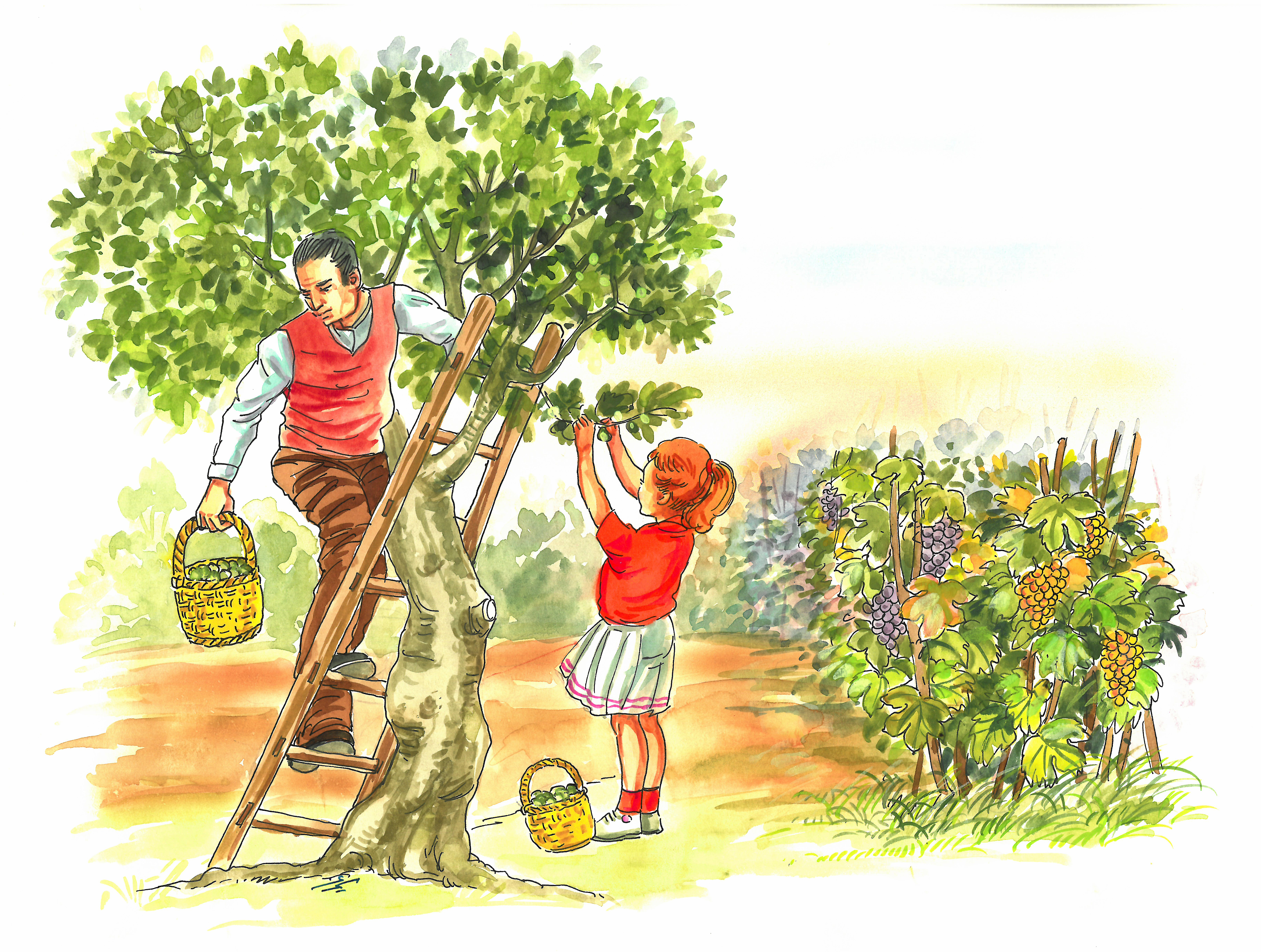 The girl is helping her father in harvesting green apples and putting them in a basket.