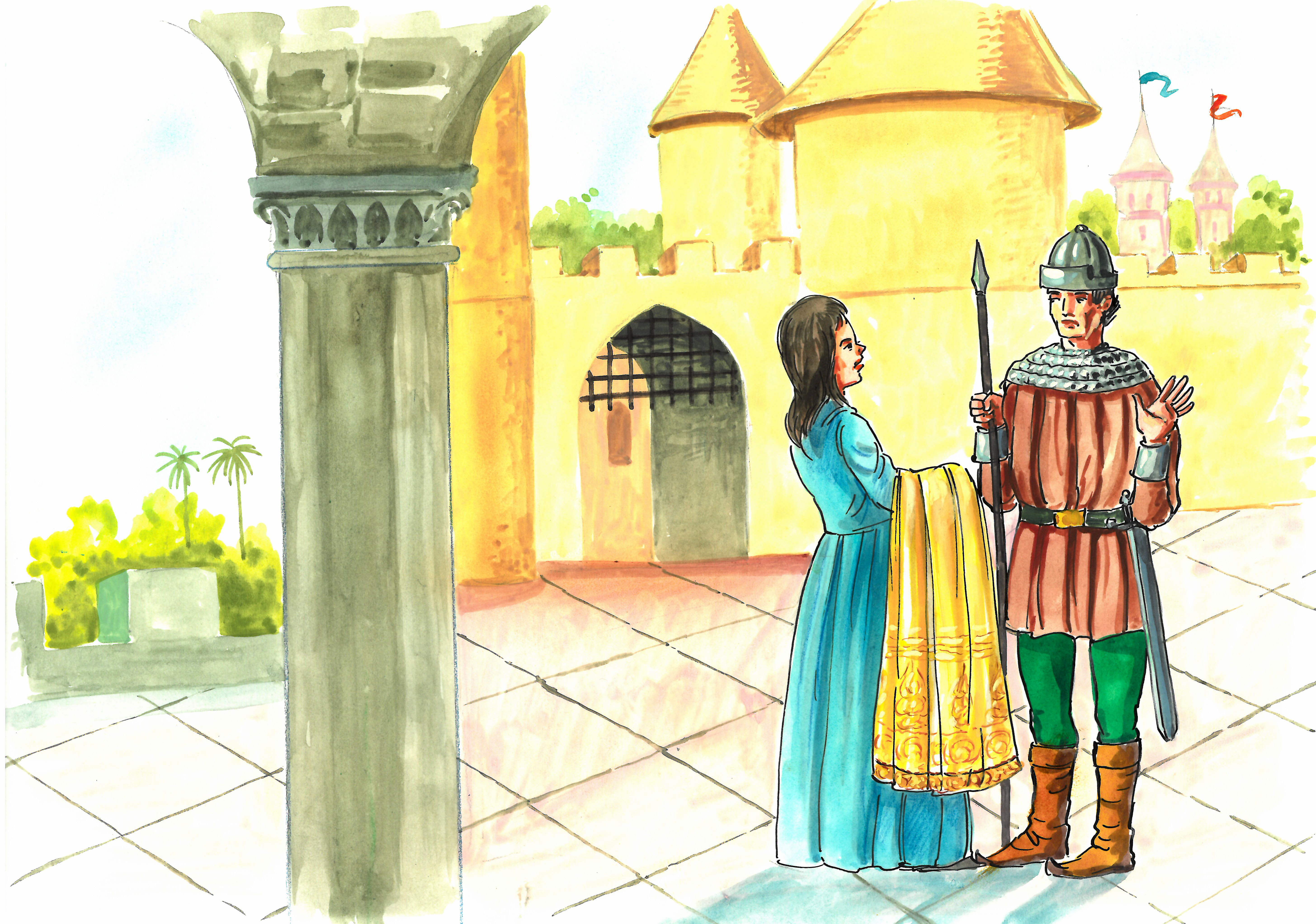 The image shows a woman carrying a piece of cloth talking to a guardsman infront of the gates of a walled castle.