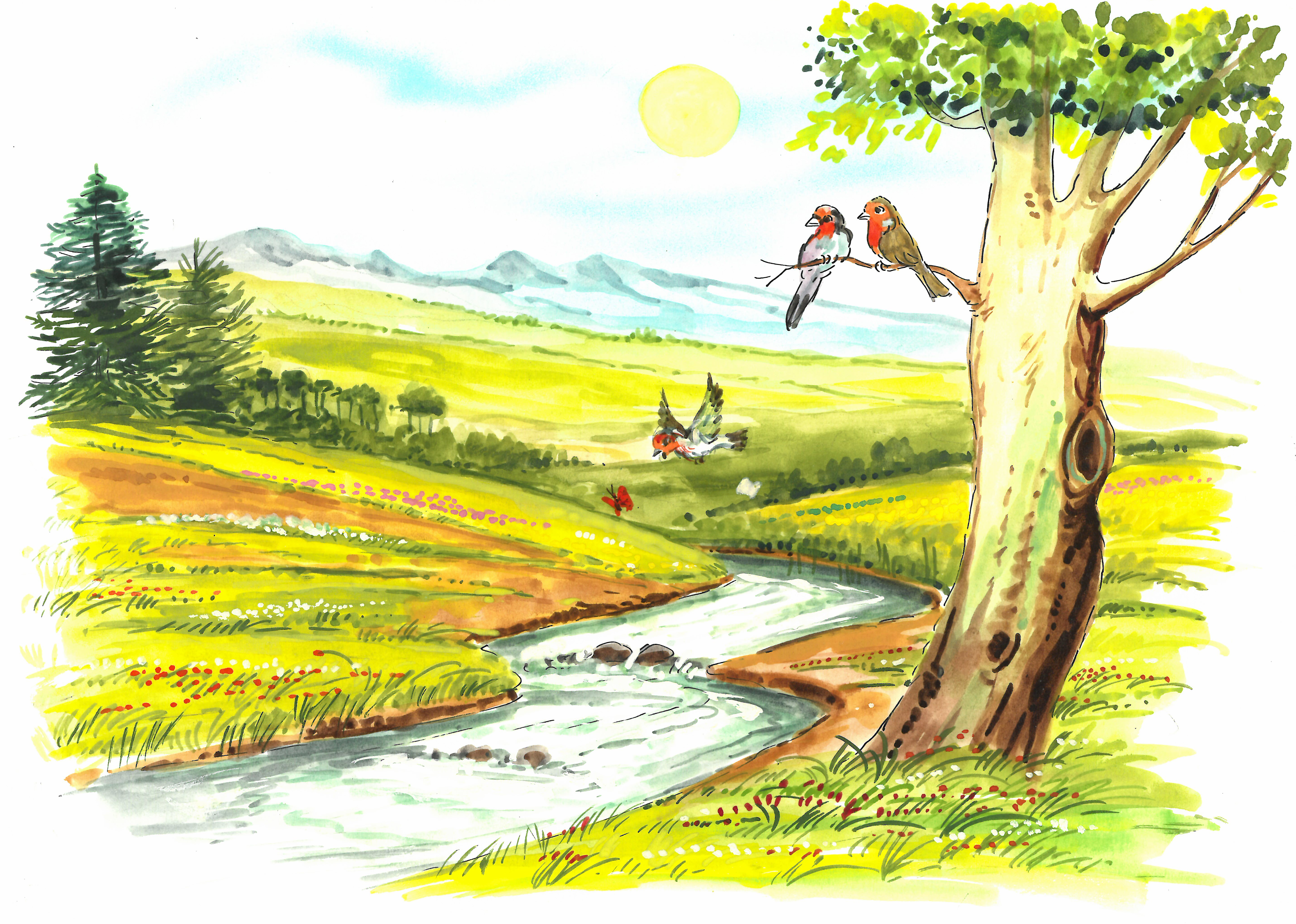 What the painter wants to focus on is the beauty of nature in the countryside on a summer day. The image shows the green highlands and the river flows between the hills and the birds with there bright colors.