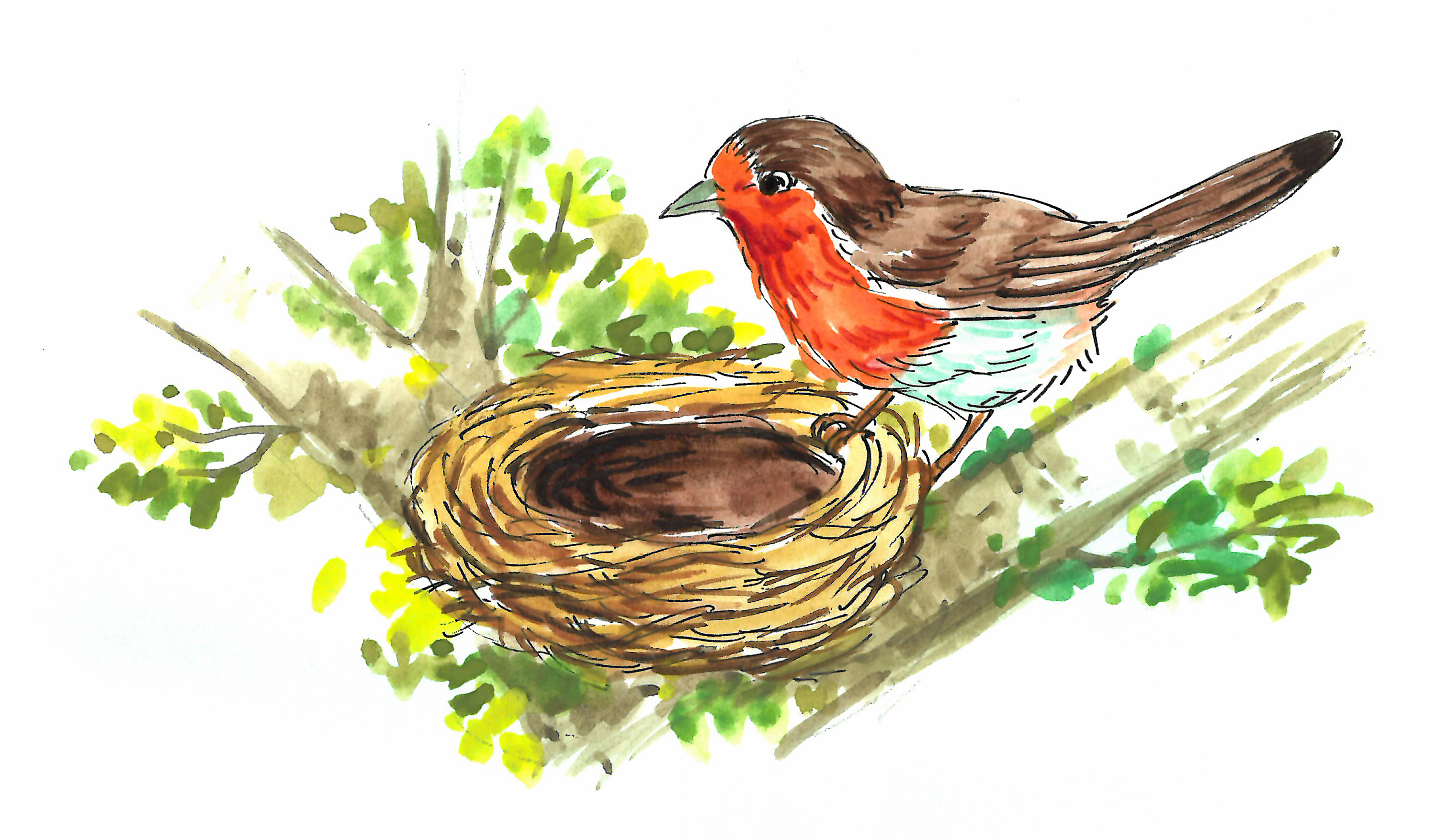 The image shows a red robin resting on a finished nest resting upon a tree branch.